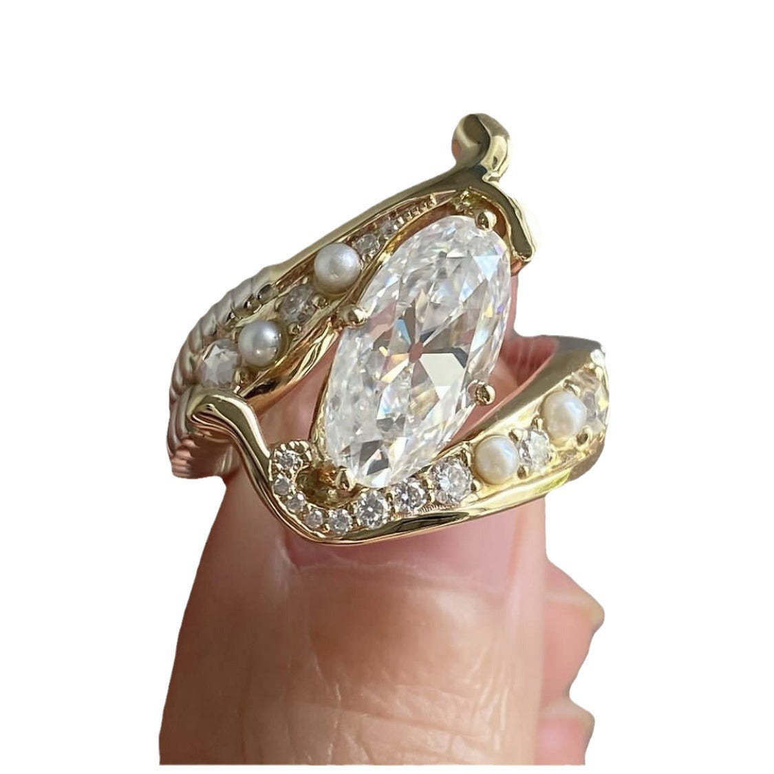 Product information: Type: Ring Treatment Process: Electroplating Color: Gold Applicable population: Female Size: no.5, no.6, no.7, no.8, no.9, no.10, no.11 Material: Imitation Pearl Popular elements: Asymmetric